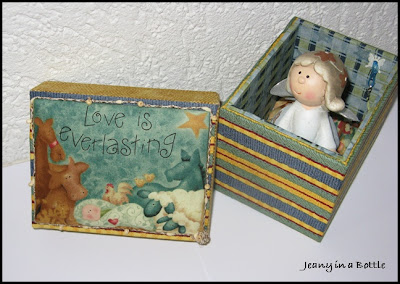 Am liebsten mache ich kleinere Schachteln mit etwas lustiges drin oder dran. Und weil ich an ein Promo für ein Workshop arbeite will ich viele verschiedene Vorbilden zeigen können. So wie dieser kleiner Engel Schachtel. Der Engel sitzt auf ein kleines Kissen und guckt raus aus der schachtel. Der Stoff ist von Debbie Mumm, und die Abbildung auf der Deckel ruft "Geburt" finde ich. Also ein tolles Geschenk wenn ein Baby geboren ist. Schnell fertig, ein lustiges endeffect, und ein richtiges tolles Geschenk... finde ich ☺.